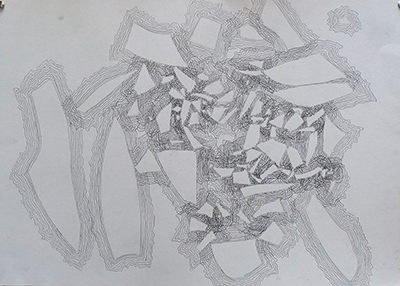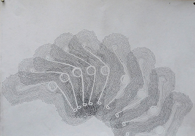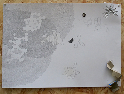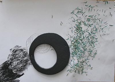 Event Horizons pencil, charcoal, foam and coloured wood shavings on paper, A2, 2021