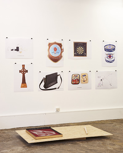 Materials: Chalk, found display drawer lined with plum coloured velvet, fishing line, panel pins. Made by Krenn and O’ Beirn in response to loyalist testimony.