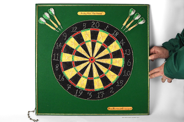 This dartboard* was probably sent out from Long Kesh in end of 1974 or 1975. It says at the bottom ‘From Martin, with respect’. He would be among the last few internees to be released because he had such a big name in republican circles. He and certain other people were let out last, for whatever reason. The British obviously thought that up.