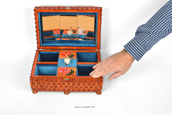 Materials: Ballerina doll, blue velvet, brass fittings, chess pawns, clothes pegs, mirror, music box mechanism, paint & varnish