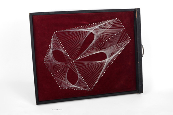 Materials: Coloured metallic threads, lollypop sticks, green baize, metal chain, panel pins & plywood