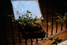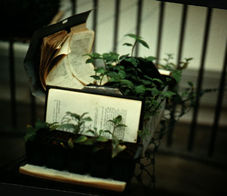 of an open book and the plant Wandering Sailor planted in a particular container.