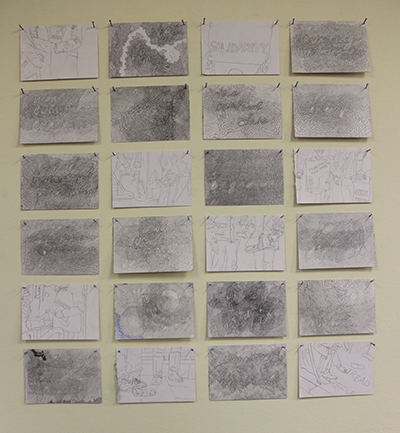 We installed the work in the PS2 project space in March 2021. It was a virtual show only seen online, due to the Coronavirus Lockdown regulations. Given the format we also produced downloadable zine to print out at home. In addition we produced a scrolling text piece and a sound piece of extracts from the collaborative dialogue. The audio piece formed the sondtrack of a film of the show produced by Leander Mutshcler.