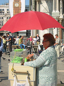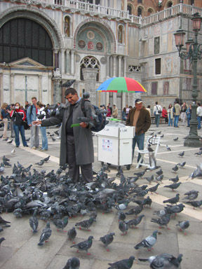 Vendors who sell pigeon feed for 1 euro a bag to the many tourists who flock