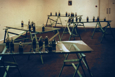 The bottles are placed, apparently randomly, on tressels at hip height, but when