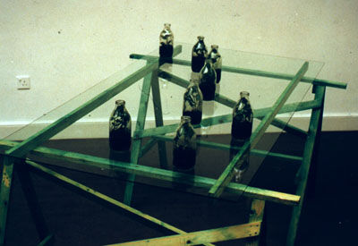 Mixed media, plants, wood, sheet glass, glass bottles, photographs